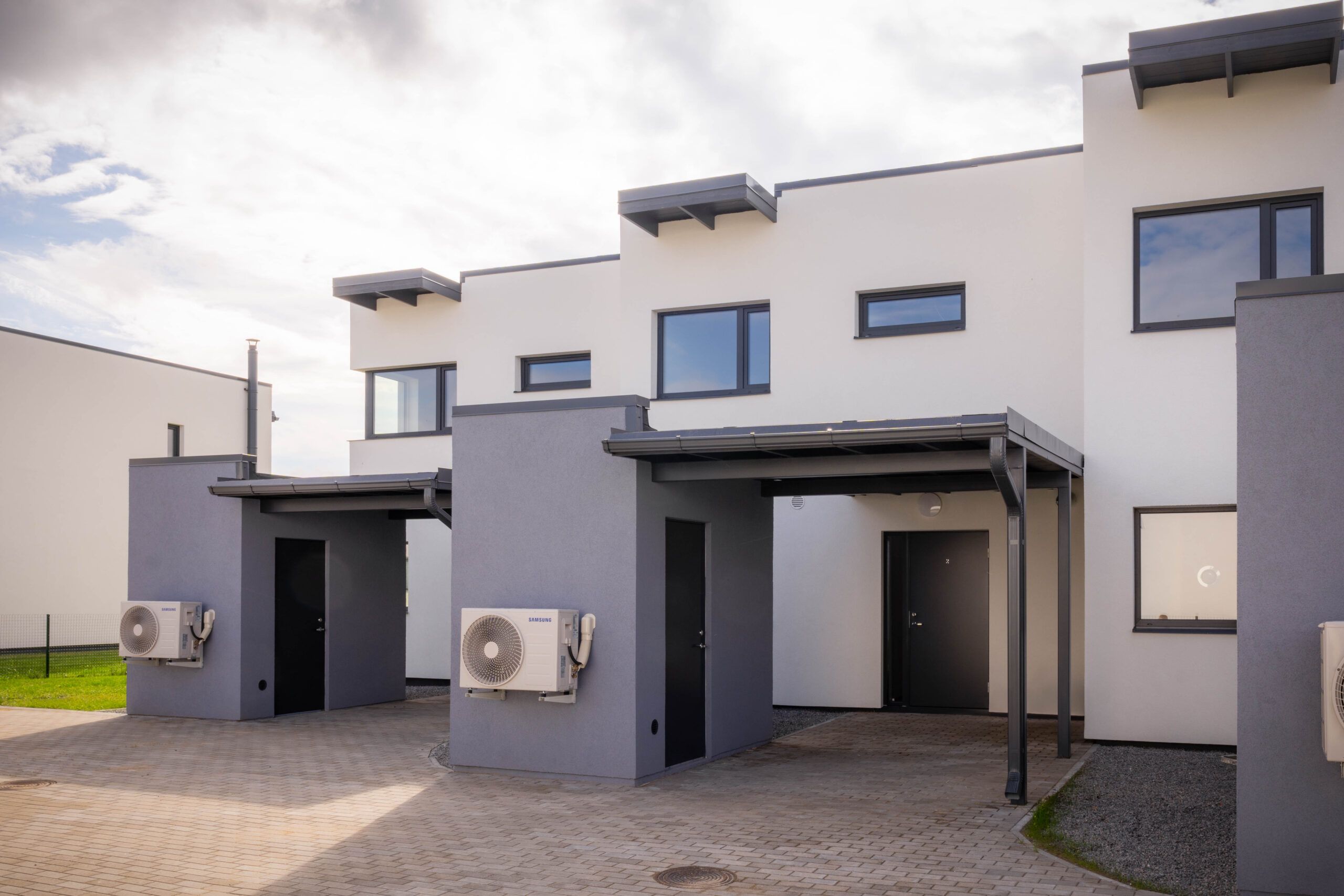 Each unit, with a net area of 101.1m² (living space 95.9m², utility room 3.5m², and technical room 1.7m²), includes a terrace on the first floor and a balcony on the second floor. Each apartment comes with two designated parking spaces in the yard based on usage rights.